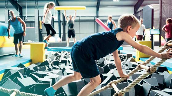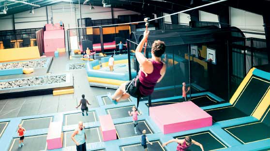 Der modernste Trampolinpark Deutschlands bietet eine große Bandbreite an Attraktionen und Modulen. Die Besucher kommen an der großen Kletterwand oder im Hochseilgarten hoch hinaus, können sich im Ninjaparcours beweisen oder im Kindertobeland spielen.