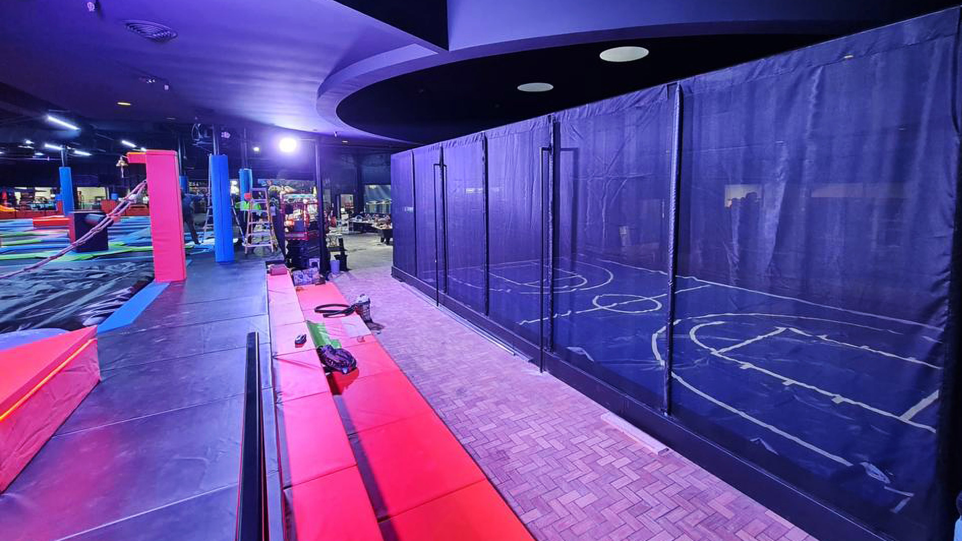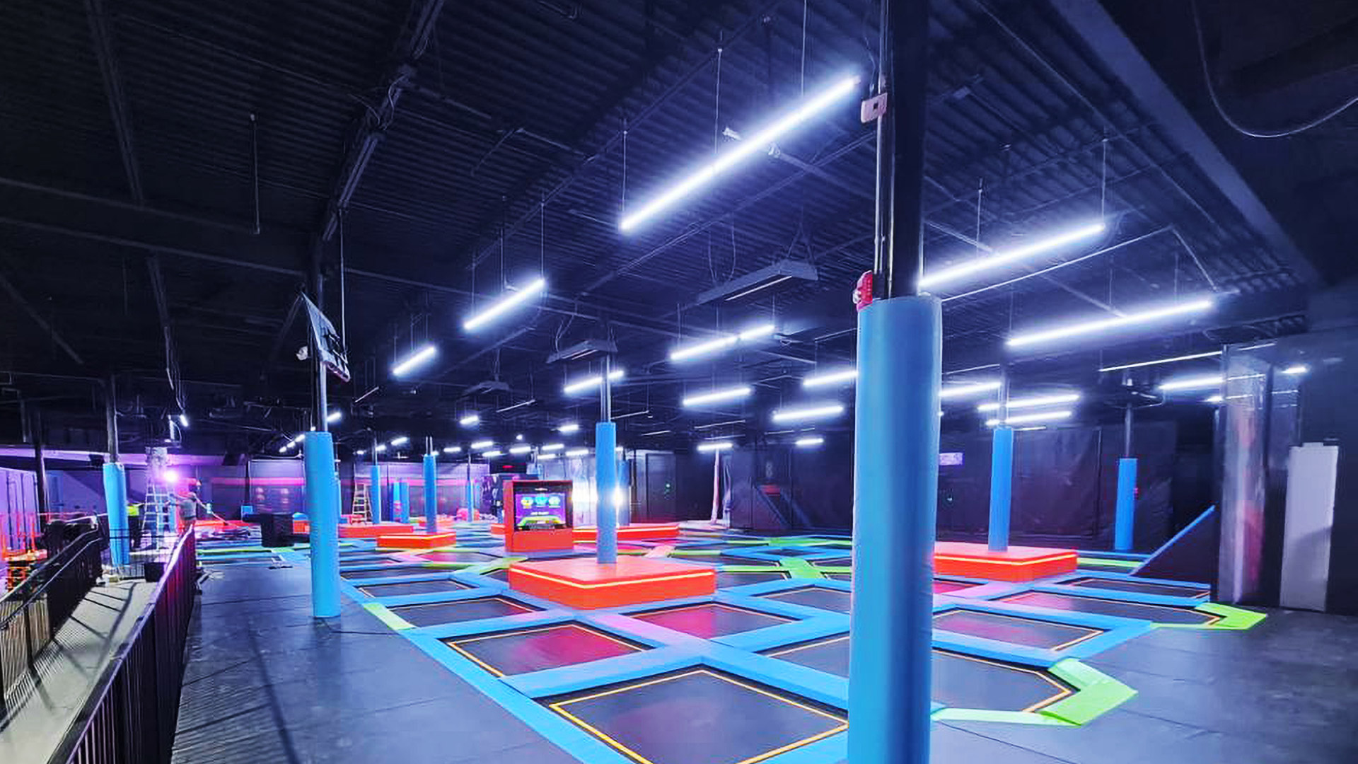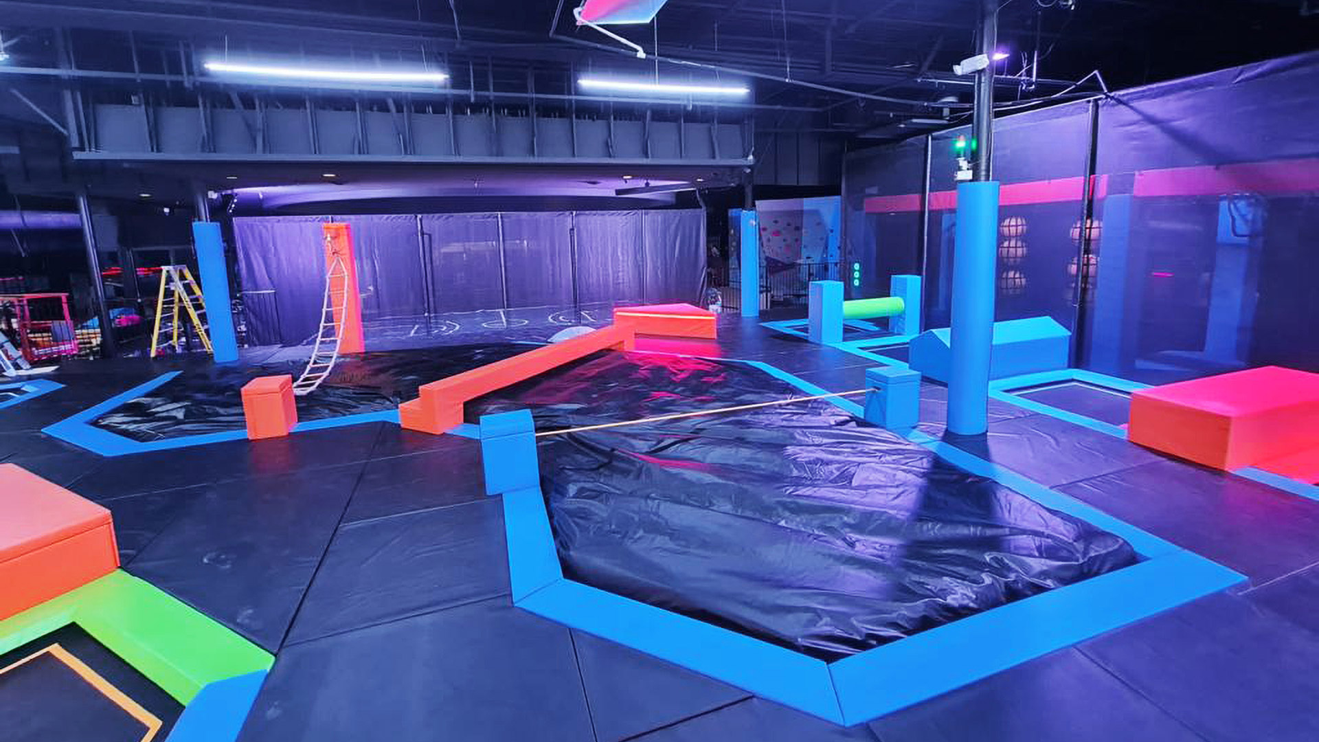 Wir haben kürzlich einen weiteren Trampolinpark in den Vereinigten Staaten ausgestattet – das Family Fun Center – Thrive, fertiggestellt im Jahr 2024. Der Trampolinpark erstreckt sich über eine weitläufige Fläche von 1450 Quadratmetern. Unser Design umfasst spannende Funktionen wie integrierte LED-Beleuchtung für ein visuell immersives Erlebnis, eine Sprungmatte mit Soundeffekten und unser neues Modul „SIlk Ropes“, ein innovatives Modul, das eine sichere Plattform für Kletter-, Dreh- und Schaukelaktivitäten bietet. Dieser Zusatz sorgt für eine sichere und angenehme Landung und eignet sich daher ideal zum Üben gewagter Stunts über Schaumgruben.