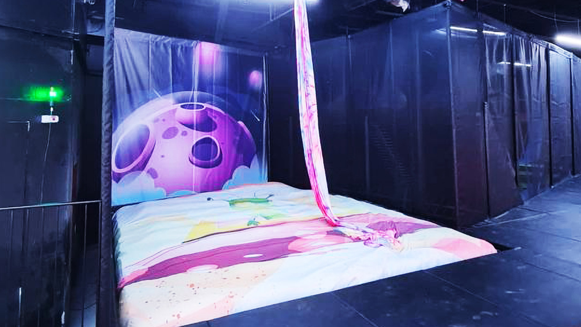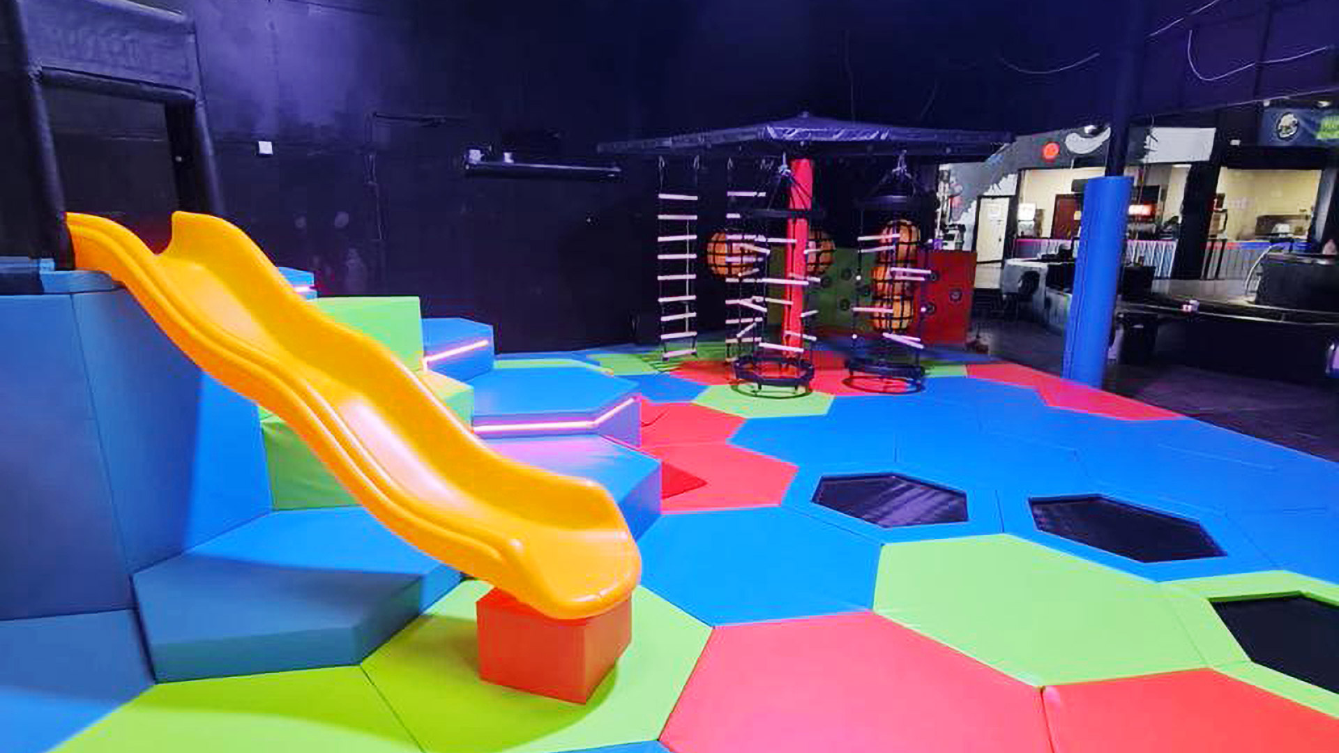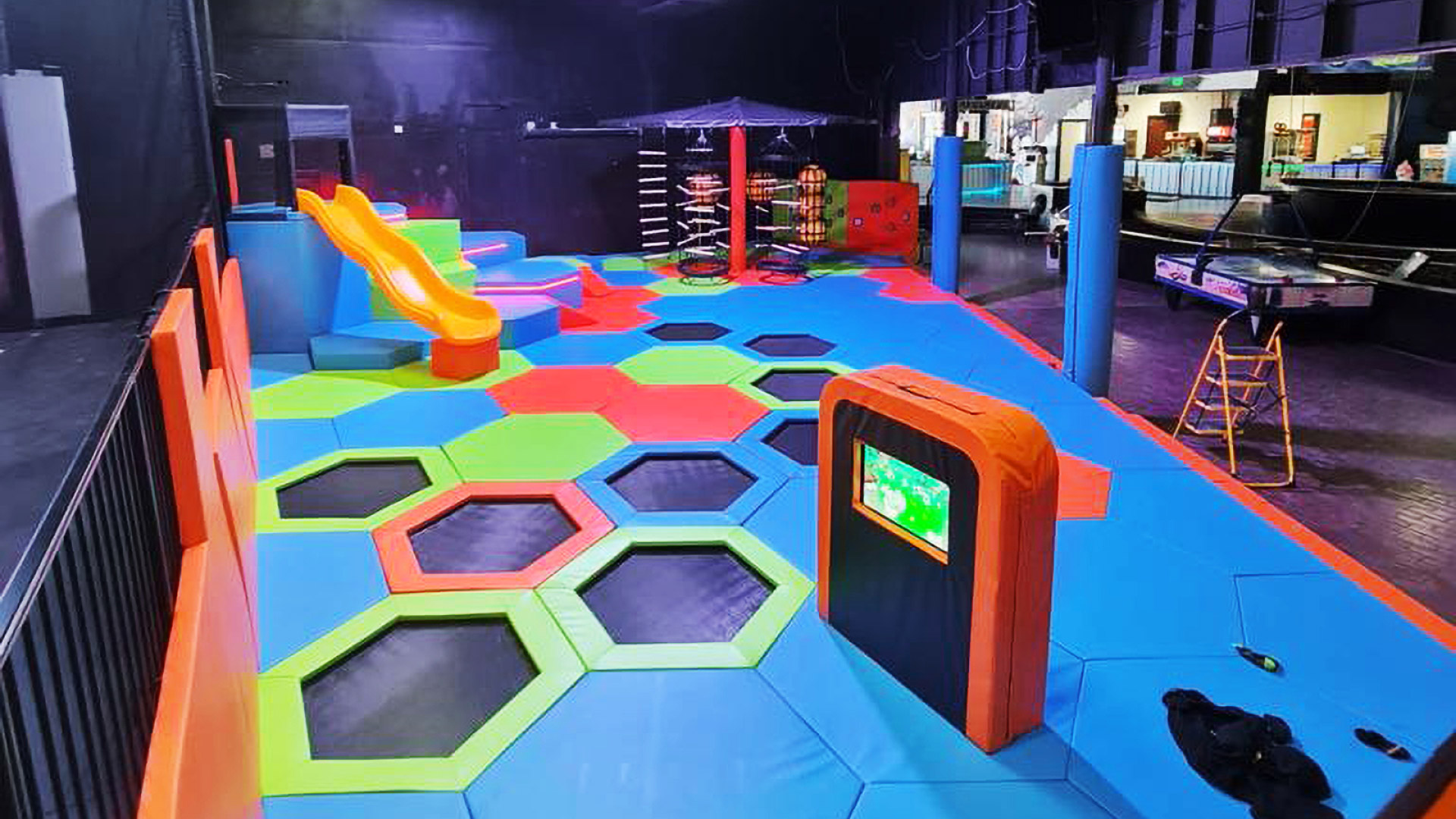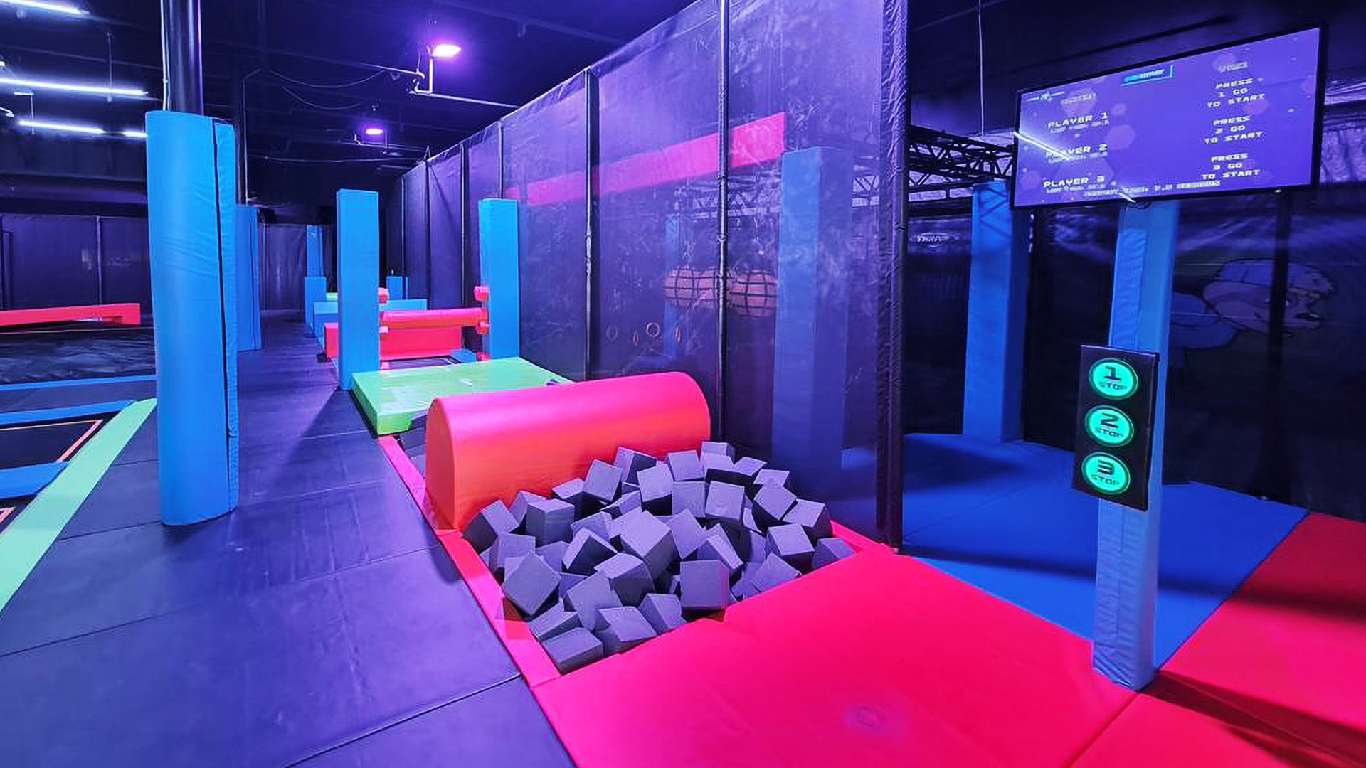 Wir haben kürzlich einen weiteren Trampolinpark in den Vereinigten Staaten ausgestattet – das Family Fun Center – Thrive, fertiggestellt im Jahr 2024. Der Trampolinpark erstreckt sich über eine weitläufige Fläche von 1450 Quadratmetern. Unser Design umfasst spannende Funktionen wie integrierte LED-Beleuchtung für ein visuell immersives Erlebnis, eine Sprungmatte mit Soundeffekten und unser neues Modul „SIlk Ropes“, ein innovatives Modul, das eine sichere Plattform für Kletter-, Dreh- und Schaukelaktivitäten bietet. Dieser Zusatz sorgt für eine sichere und angenehme Landung und eignet sich daher ideal zum Üben gewagter Stunts über Schaumgruben.