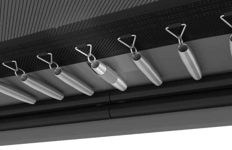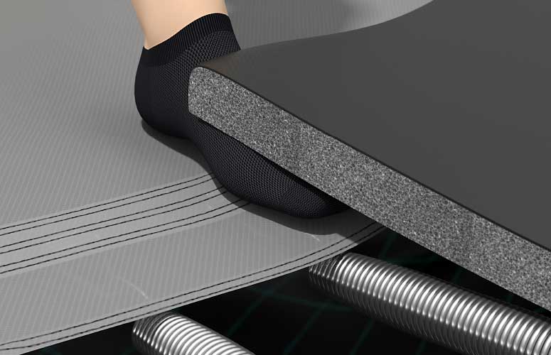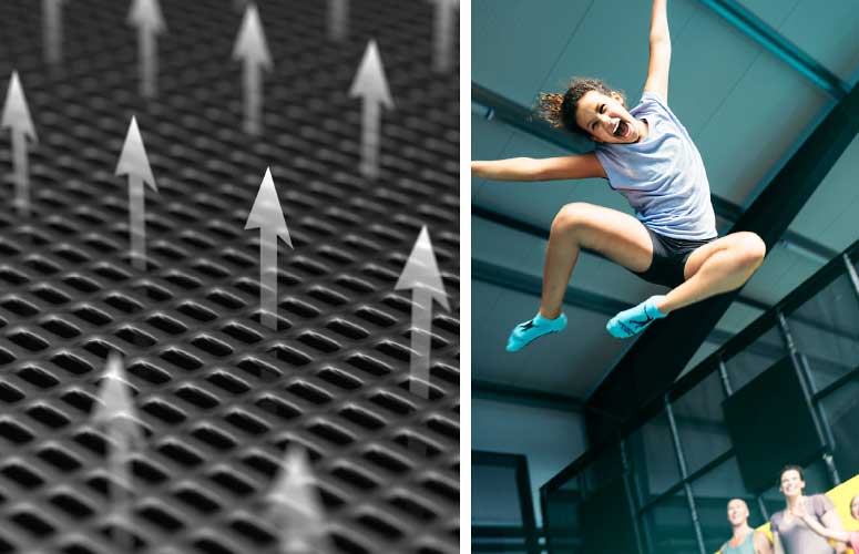 Das besondere Design und die Vorspannung der Federn sorgt für eine erhebliche Verringerung der G-Kräfte, die beim Springen auf Wirbelsäule und Gelenke wirken. Dadurch wird das Springen sicherer, bei einem gleichzeitig auffallend guten Sprungverhalten. Alle Federn werden hausintern hergestellt und gründlich geprüft, um mindestens 2,5 Millionen Sprünge auszuhalten.