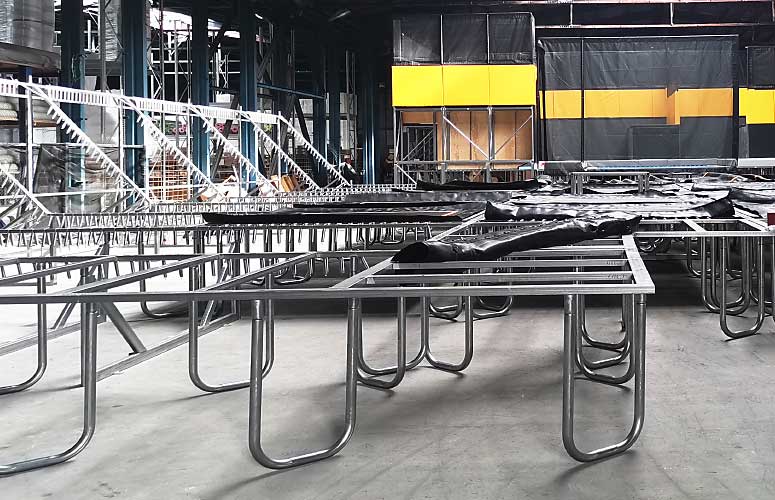 Alle Trampolinkomponenten werden in der Produktionsstätte von Akrobat hergestellt, inspiziert und vormontiert.