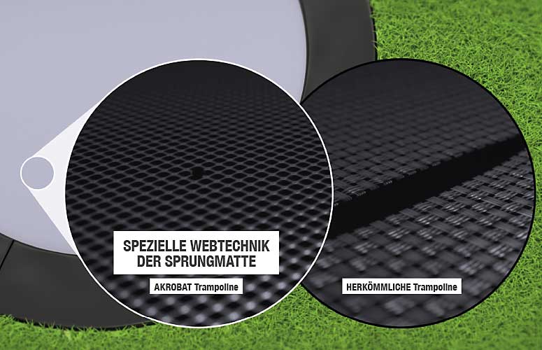 Unser Entwicklerteam hat das Design der AKROBAT-Trampoline auf ein völlig neues Level gehoben: Das luftdurchlässige Sprungtuch sorgt dafür, dass die Rahmenpolster sicher fixiert bleiben und nicht verrutschen, damit keine störenden Klatschgeräusche entstehen.